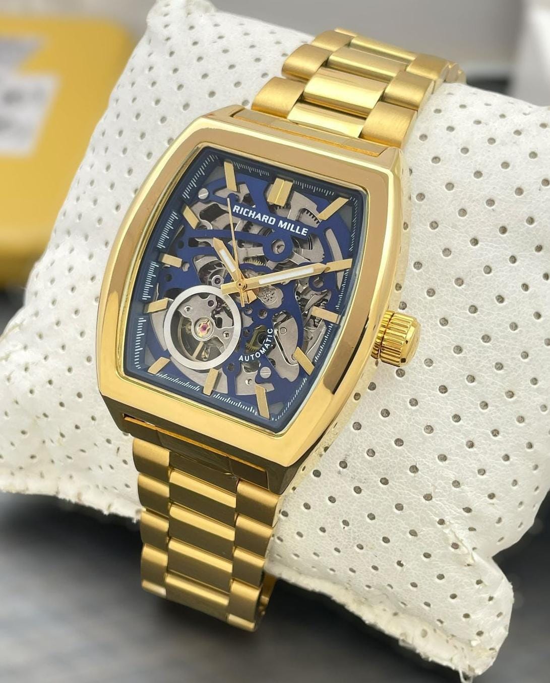In essence, this watch is a masterpiece of contrast and confidence. It masterfully blends the gravitas of a full gold design with the modern, high-tech appeal of a skeletonized blue movement, resulting in a timepiece that is both a status symbol and a piece of wearable art.