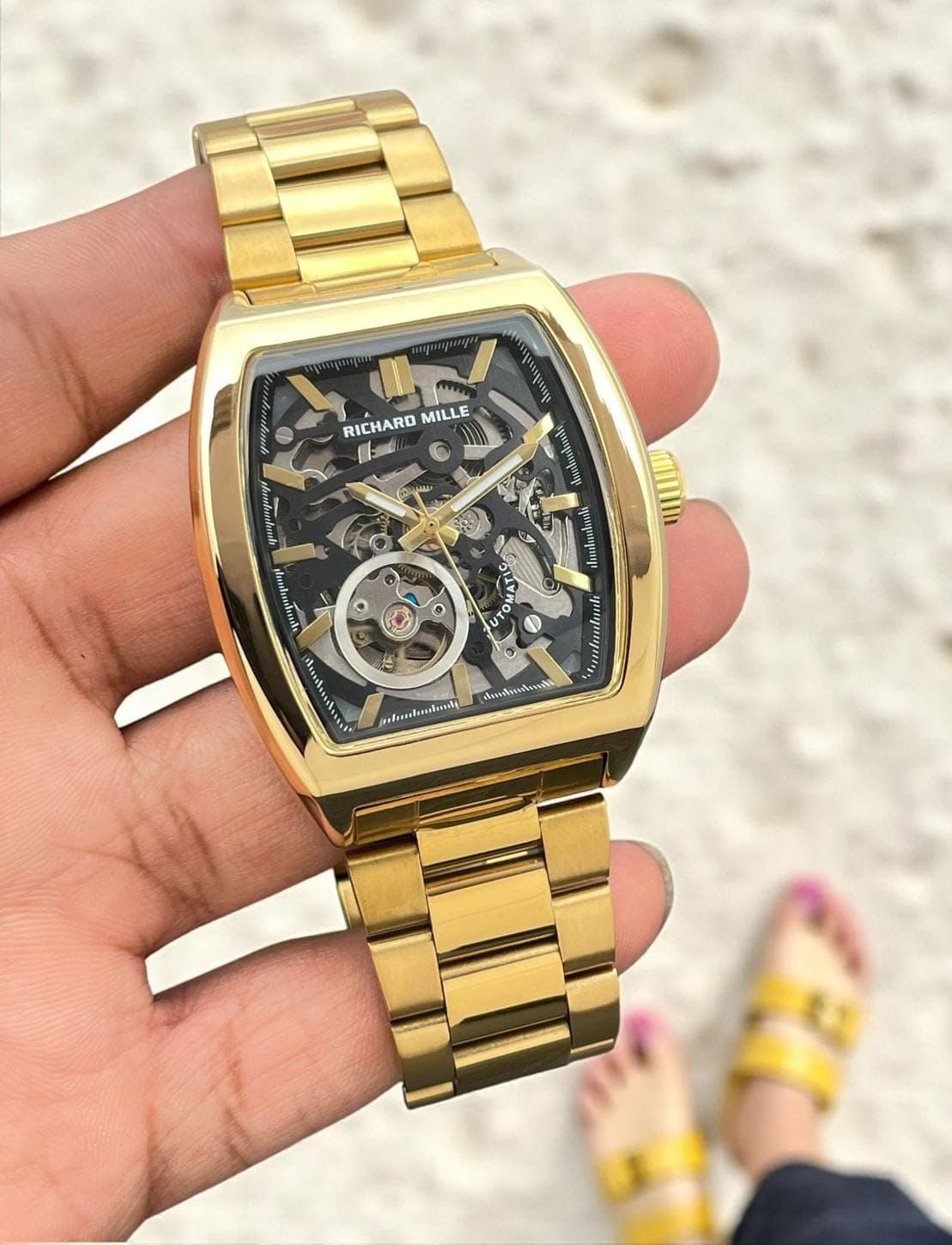 The Case & Bracelet: Uncompromising Gold The watch’s iconic tonneau (barrel-shaped) case and integrated bracelet are bathed in a rich, polished gold finish, creating a seamless and powerful statement of opulence. The case’s ergonomic curves are designed to fit the wrist perfectly, offering a comfortable presence despite its bold dimensions. The solid, multi-link bracelet feels substantial and secure, flowing from the case with flawless integrity. The oversized, textured crown, also in matching gold, completes the regal aesthetic while ensuring easy adjustment.